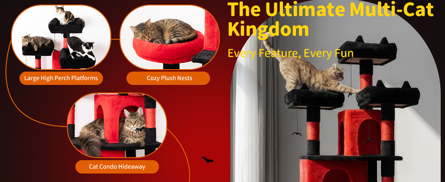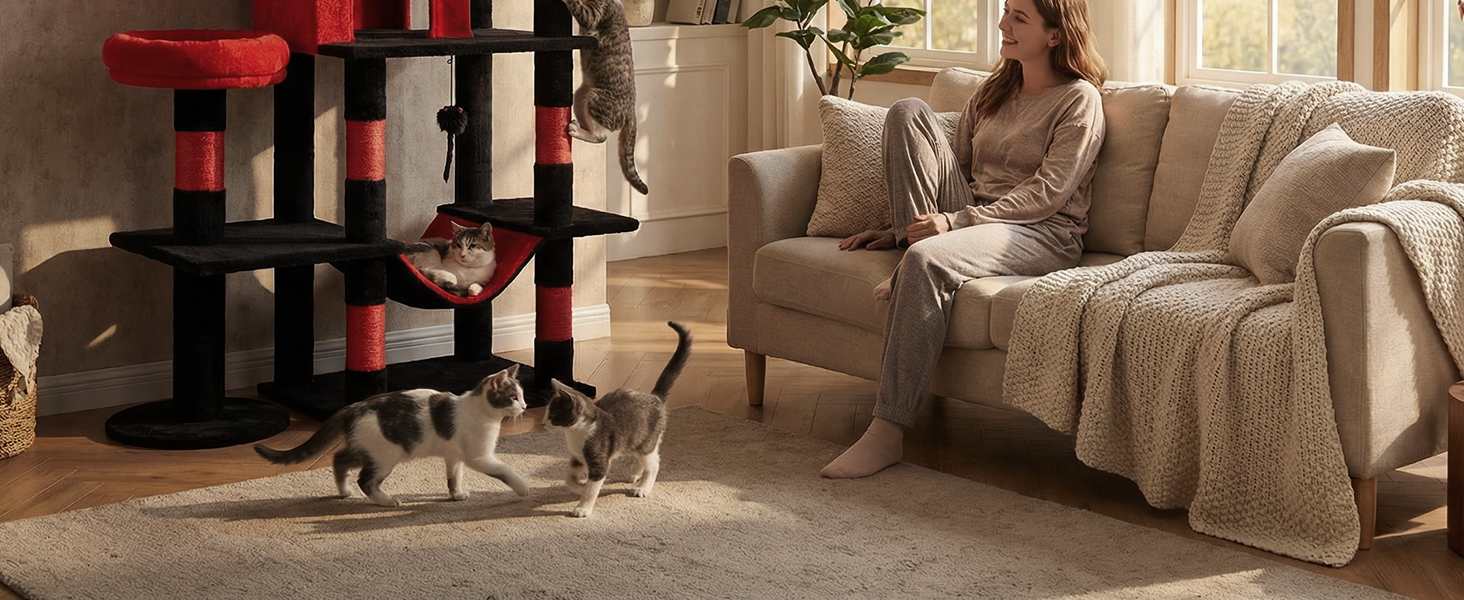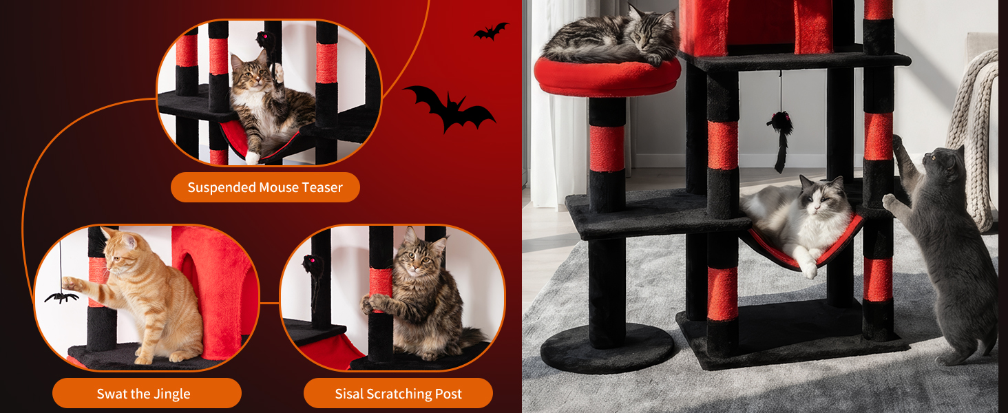 LIKISAK Heavy Duty Cat Tree for Indoor Cat, 71 Inch Large Cat Tower with Scratching Post and Top Perch, Hammock, Big Cat Condo for Adult Cats Kittens, PMT03RD, Black Red