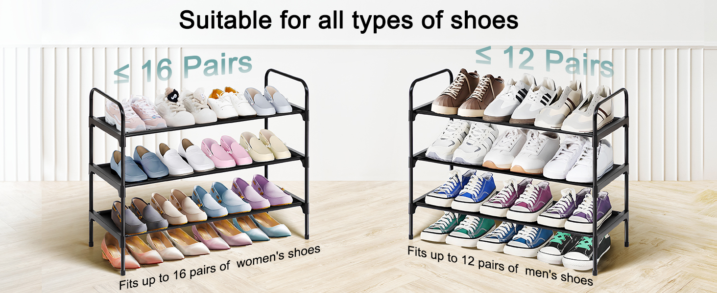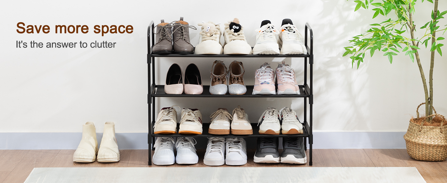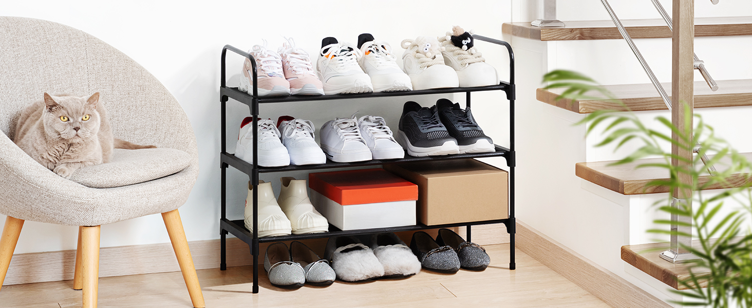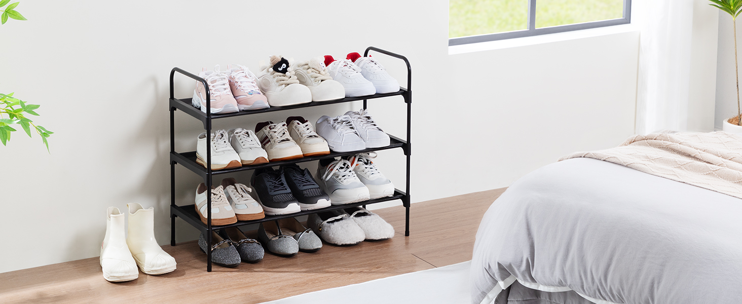 LOAKEKEL Shoe Rack, 3 Tier Non-Woven Fabric Portable Shoe Shelf, Space Saving Shoe Organizer for Closet, up to 12-16 Pairs, Shoe Storage for Entryway, Bedroom, Black HSRF03BK