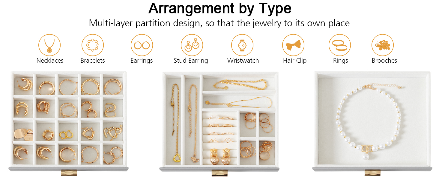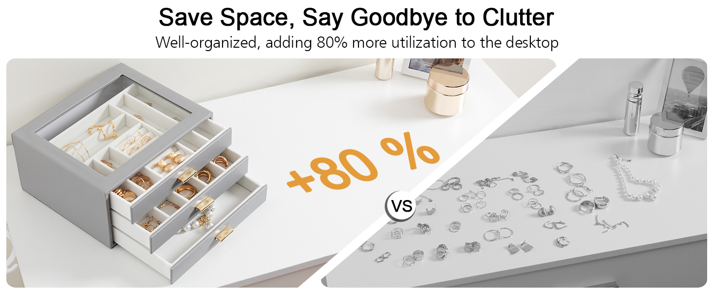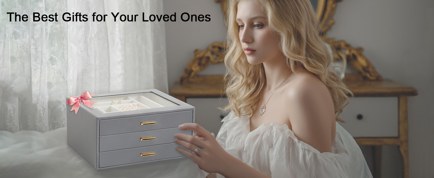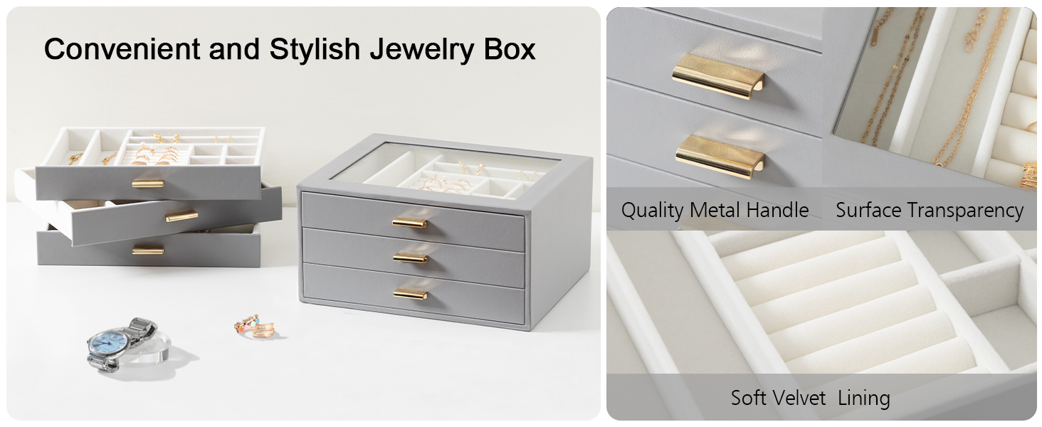 LOAKEKEL Jewelry Organizer, 3-Layer Jewelry Box with Glass Lid, Jewelry Case with 3 Drawers, Jewelry Storage for Women, Gift, Gray, CJB03GY