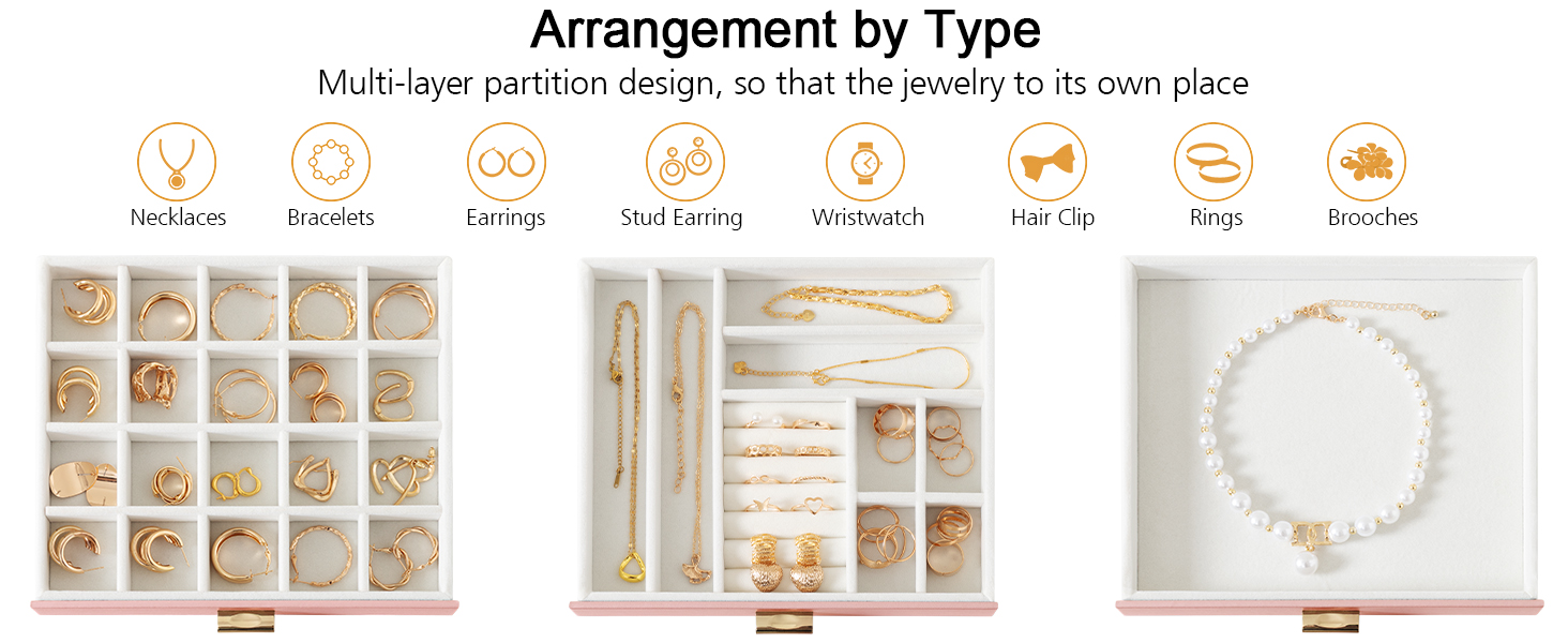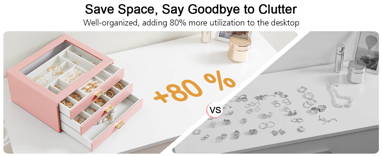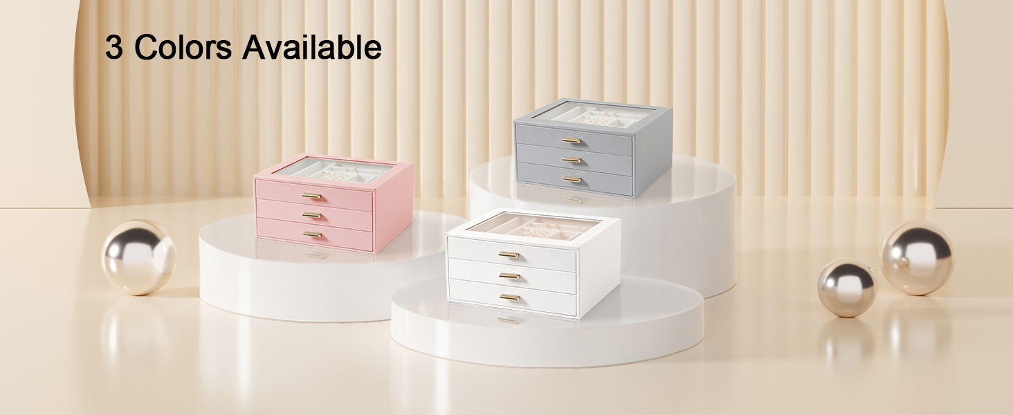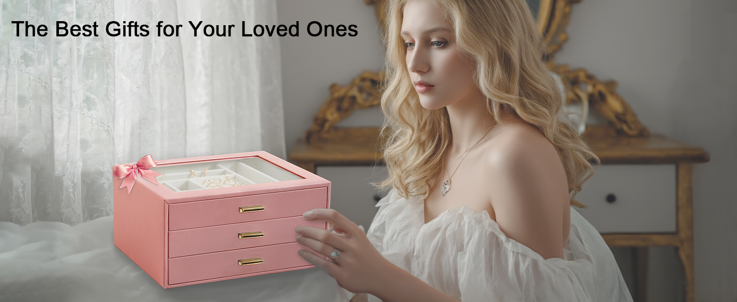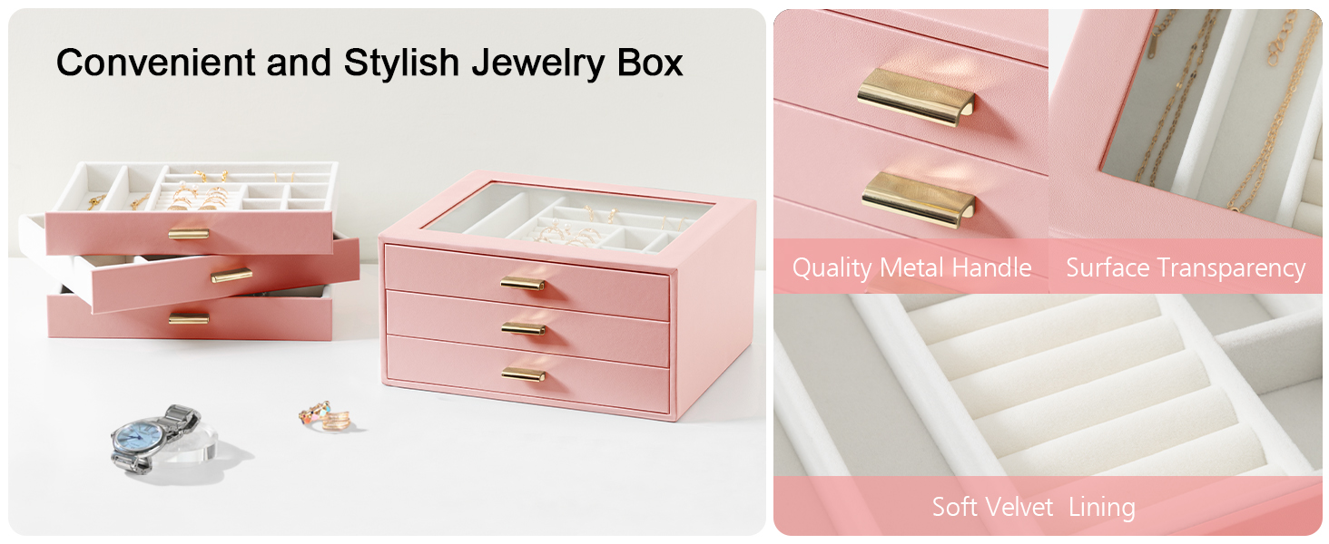 LOAKEKEL Jewelry Organizer, 3-Layer Jewelry Box with Glass Lid, Jewelry Case with 3 Drawers, Jewelry Storage for Women, Gift, Pink, CJB03PK