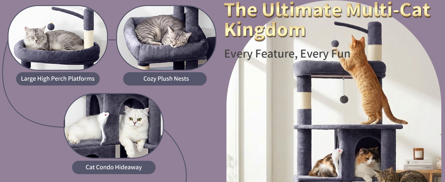 Heavy Duty Cat Tree for Indoor Cat, 74 Inch Cat Tower with Scratching Post, Hanging Basket, Cat Condo with Large Platform for Large Cats, PMT04DG, Dark Grey