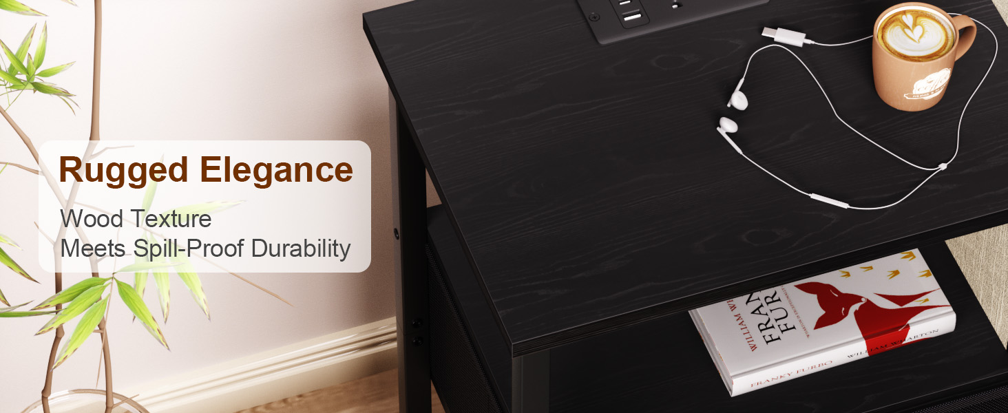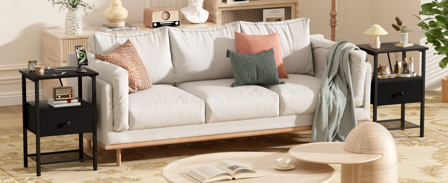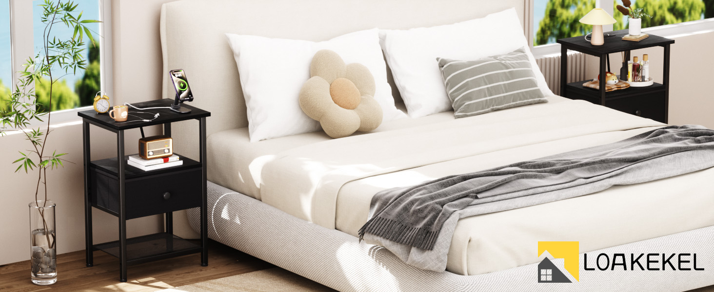 LOAKEKEL Night Stand with Charging Station, Small Bedside Table with Fabric Drawer, Nightstand with USB Ports & Outlets for Bedroom, Living Room, Black, HETS010BK-1