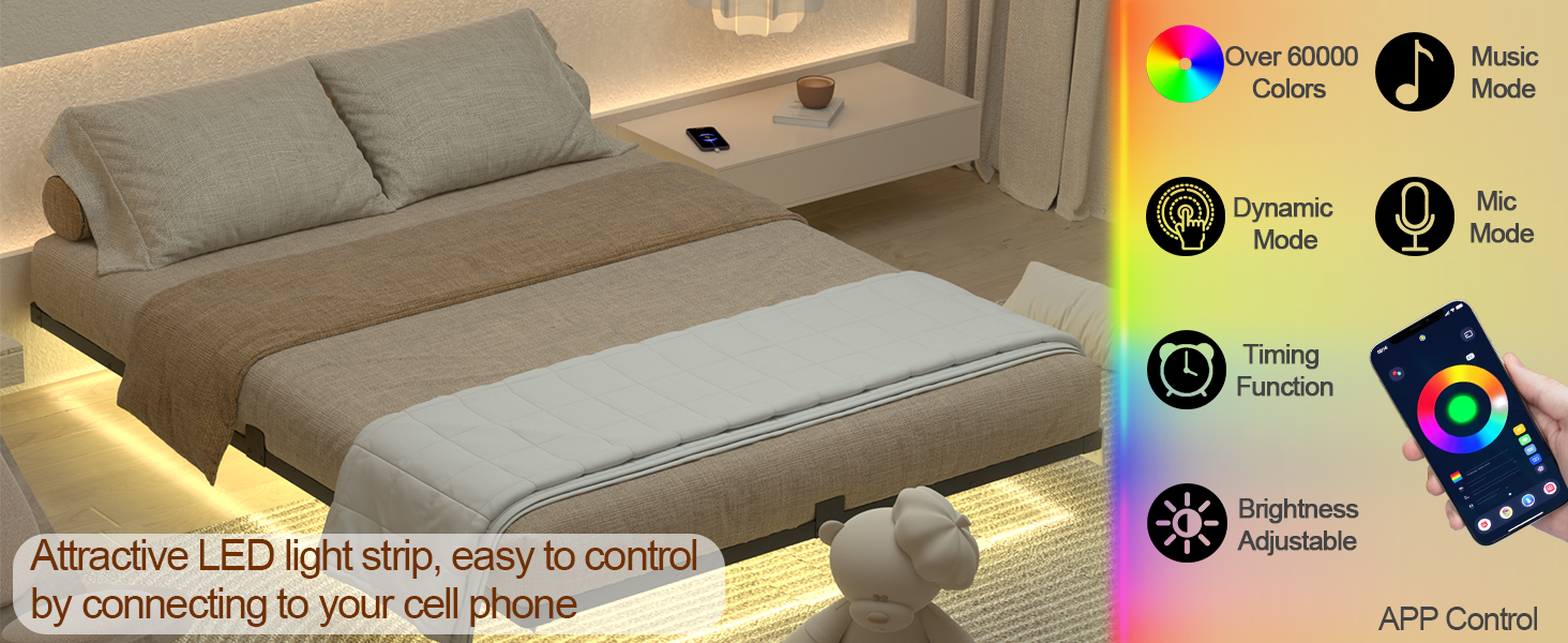 LOAKEKEL Queen Bed Frame, with USB Charging Station, Floating Bed Frame Queen Size with Smart LED Lights, Metal Platform Bed, Heavy Duty Steel Slat, No Box Spring Needed, Easy Assembly, HBF150BK