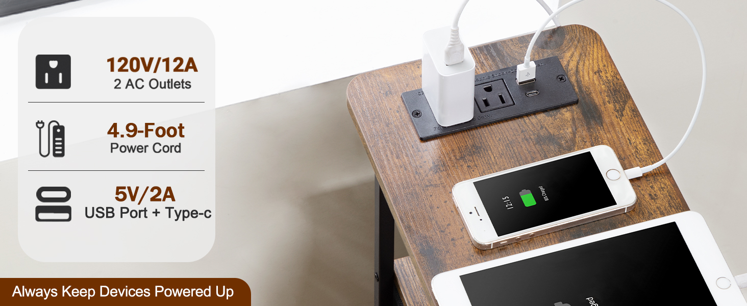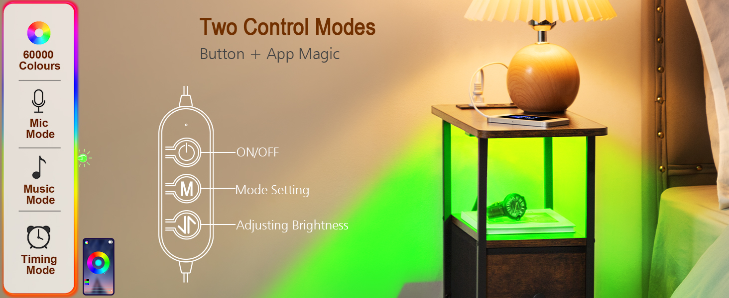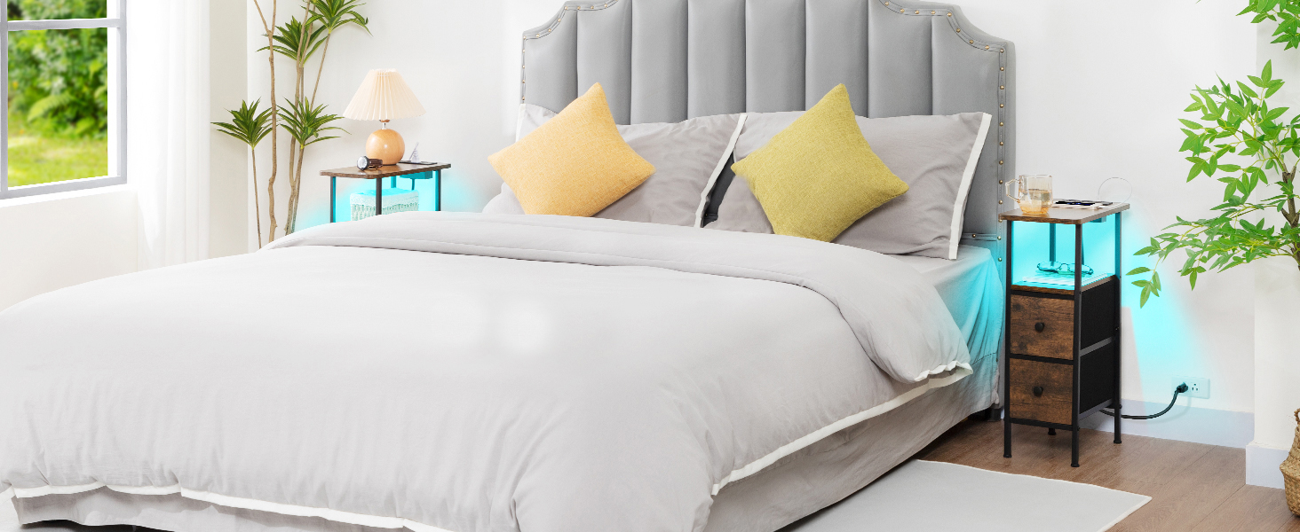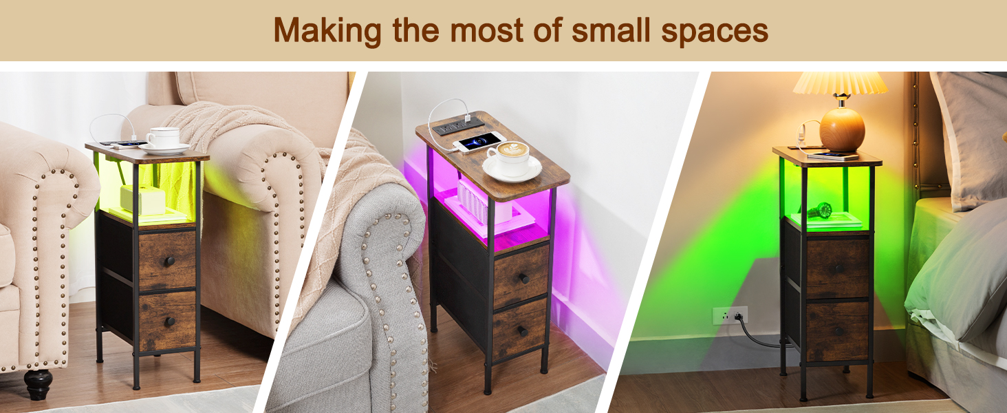 LOAKEKEL Narrow Nightstand with Charging Station, End Tables Living Room Set of 2, Skinny Side Table with Fabric Drawers, Small Sofa Table with LED Light for Bedroom, Brown, HETNDP02LBR