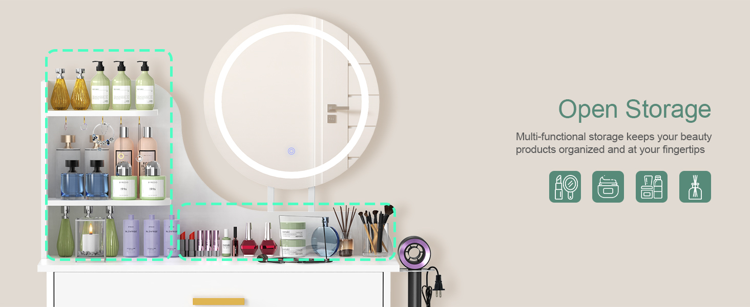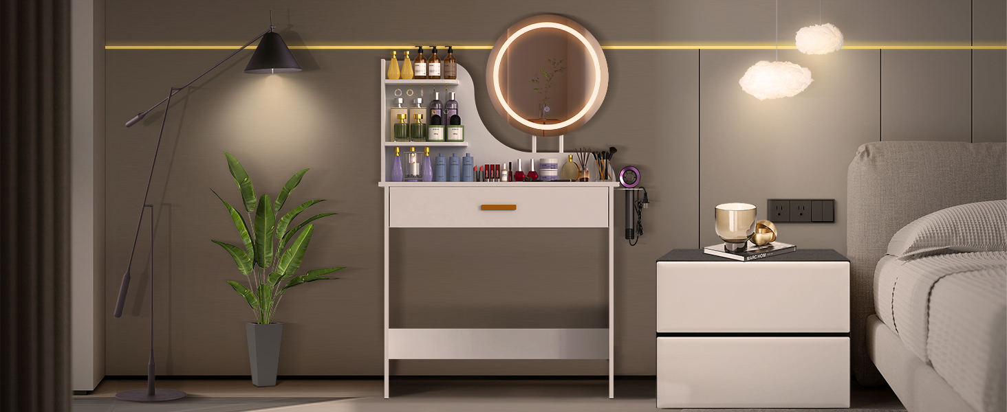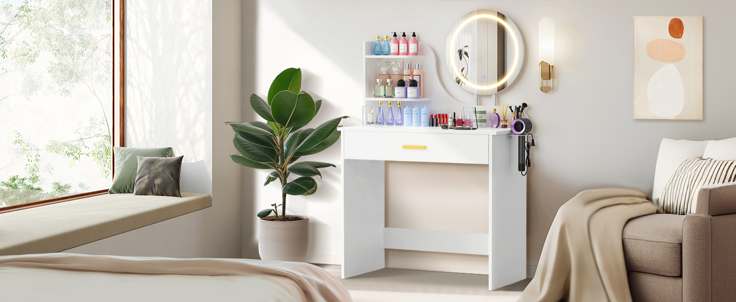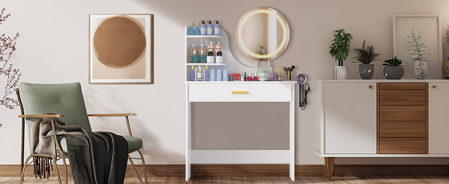 LOAKEKEL Vanity Desk, with Mirror and Lights, Makeup Vanity with Storage Drawer, Small Dressing Table with 3 Open Shelves for Bedroom, Cosmetic Table for Women and Girls Gift, White HSKP01WT